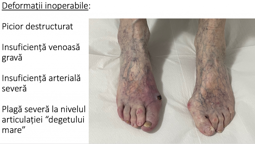 - stadiul final de evolutie este piciorul « destructurat »: total deformat, greu de incaltat si dificil de utilizat pentru ortostatism si mers.